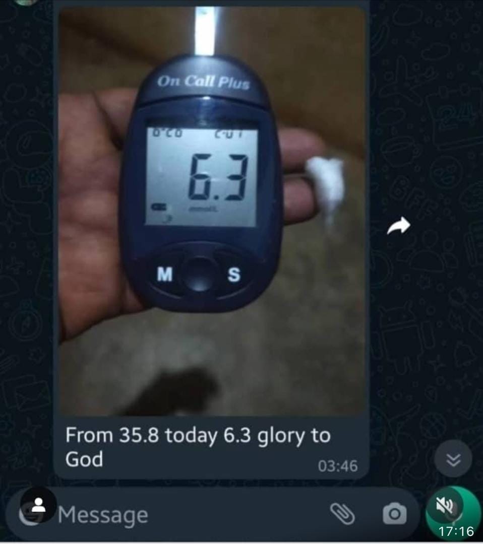 Baada ya siku 14, Ndugu yangu alianza kuona matokeo makubwa,kiwango cha sukari kilishuka kutoka 29 hadi 14.5mmoI/L, Alianza kupata nguvu lakini
